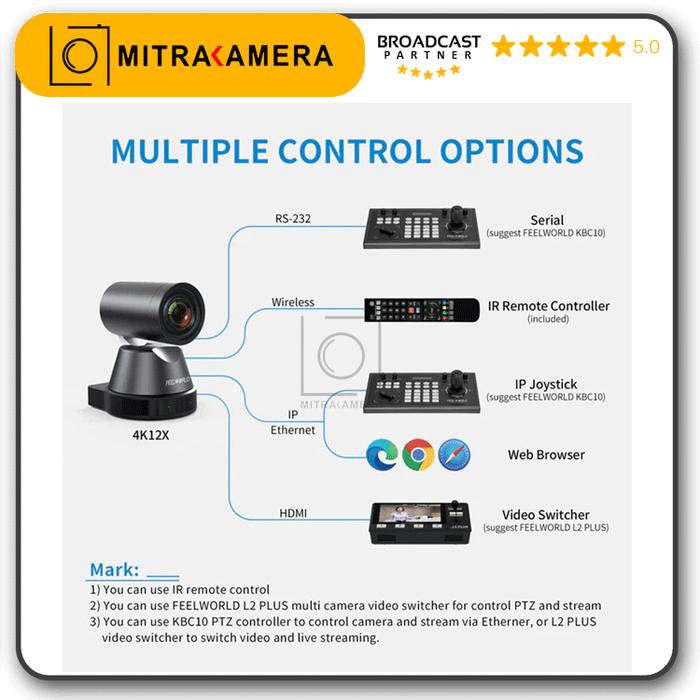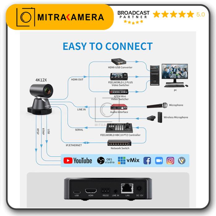 4K12X menggunakan teknologi AI canggih untuk melacak subjek secara otomatis, menjaga subjek tetap fokus saat bergerak di sekitar ruangan. Ia juga menawarkan kontrol pan/tilt yang halus dan presisi, memungkinkan Anda menangkap berbagai sudut dan sudut pandang dengan mudah.Antarmuka Multi Keluaran4K12X dirancang dengan berbagai antarmuka output, termasuk HDMI dan streaming IP. Ini memberi Anda fleksibilitas lebih besar dalam cara Anda menggunakan kamera, baik saat Anda menyambungkannya ke monitor, perangkat perekam, atau platform streaming.