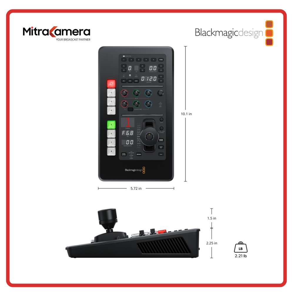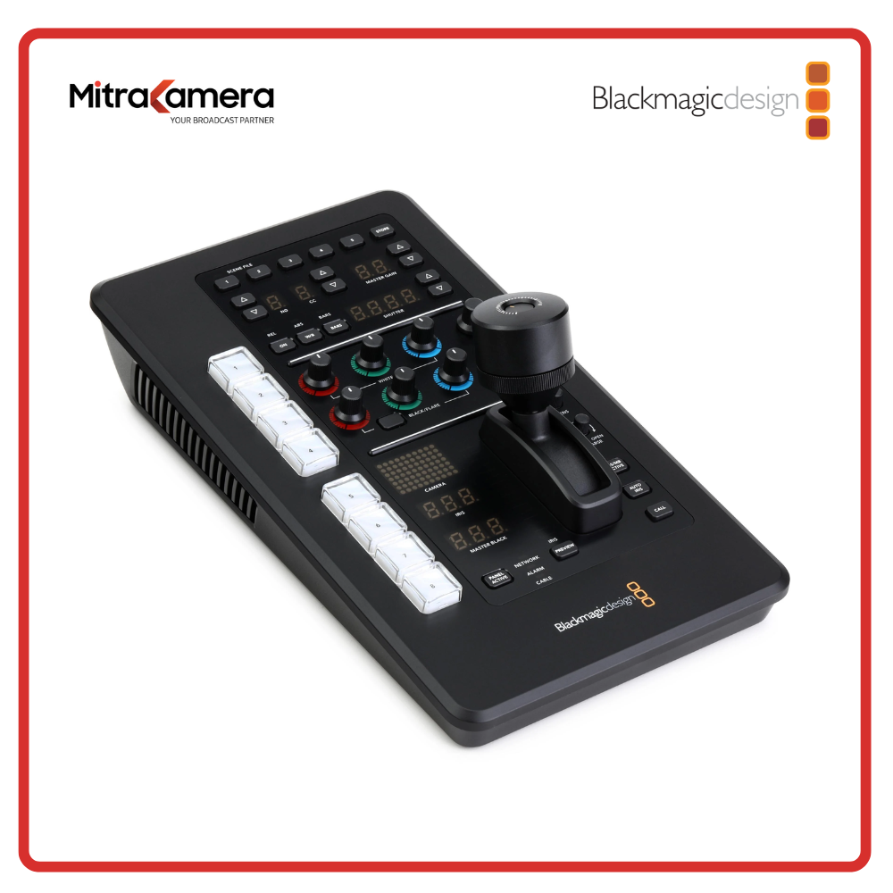 Control up to eight URSA Mini Pro, URSA Broadcast, or Blackmagic Studio cameras with the ATEM Micro Camera Panel from Blackmagic Design. This compact cousin of the ATEM Camera Control panel features eight assignable NKK camera select buttons, red/green on/off air button illumination, a 3-axis joystick, and multiple controls for iris control, preview, gain, filters, shutter, white balance, and more.