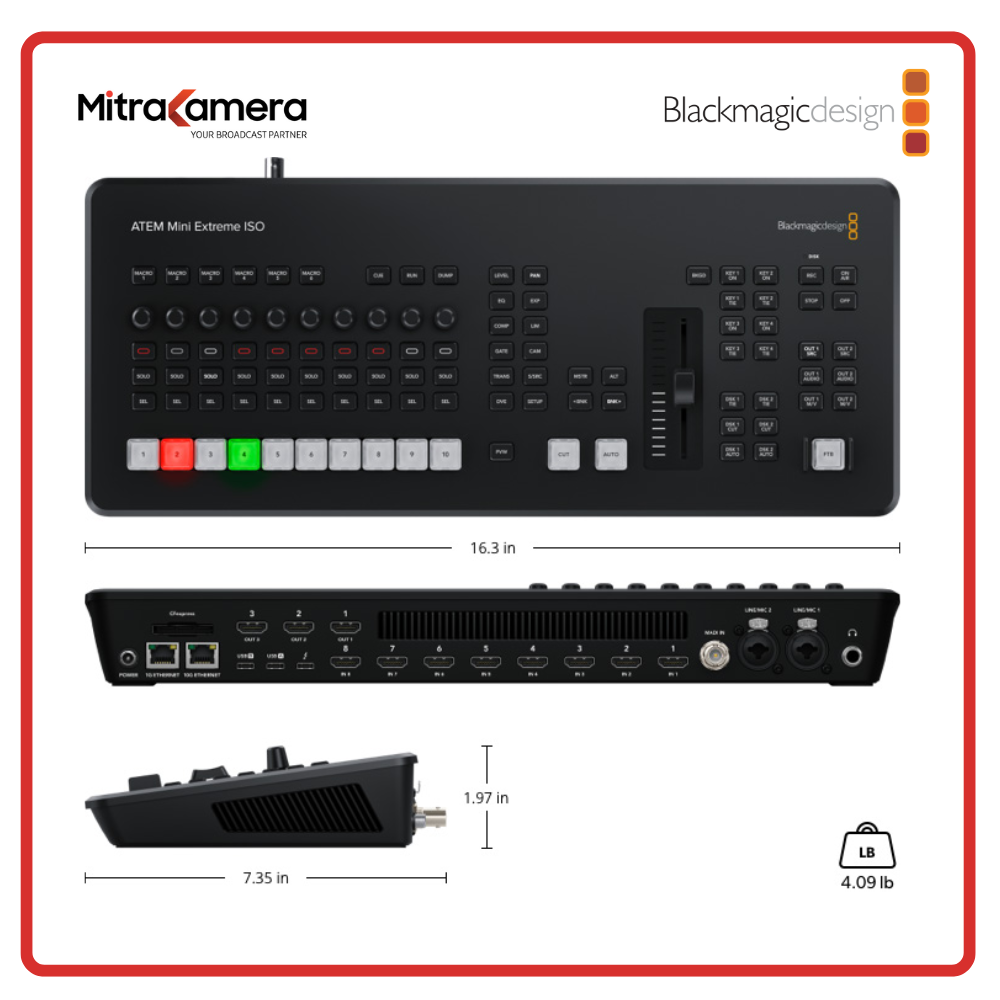 The Blackmagic Design ATEM Mini Extreme ISO Switcher is an 8-input live production switcher for live streaming. It features an integrated control panel and advanced broadcast features. In addition to live streaming using RTMP protocols, you can also output your program as if it were a webcam over USB. The switcher's ISO label means you can individually record each of the eight input videos as an MP4, as well as the program output via one of the USB-C ports.